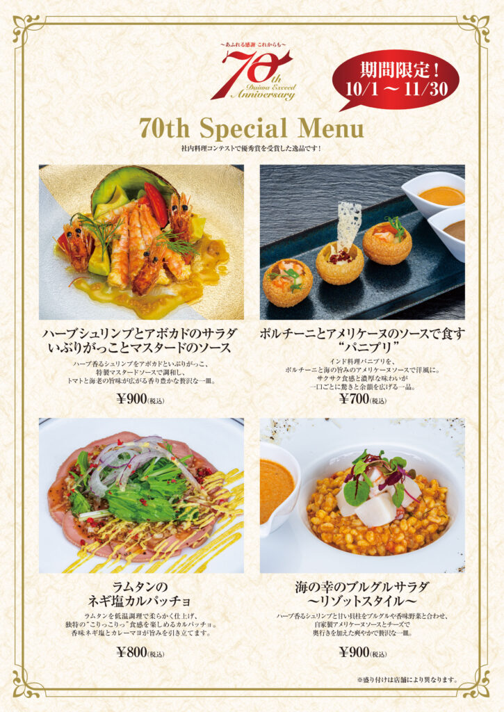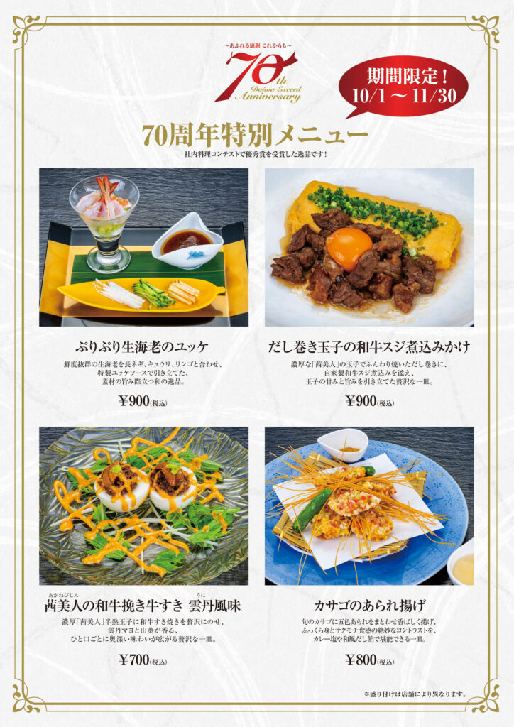 日頃のご愛顧に感謝を込めて、10月1日から11月30日までの期間、エスカイヤクラブを除く全国の一般大衆店で、社内料理コンテスト優秀賞受賞作を特別メニューとしてご提供します。全国から129品が集まったコンテストで選ばれた8品は、料理人の独創性と技が光る自信作ばかり。旬の食材を生かした華やかな一皿や、驚きのアレンジが詰まった逸品を、この期間だけの特別な体験としてお楽しみいただけます。見た目も味わいも心躍るメニューの数々で、いつもと違う食の楽しみをぜひ体感してください。皆さまのご来店を心よりお待ちしております。