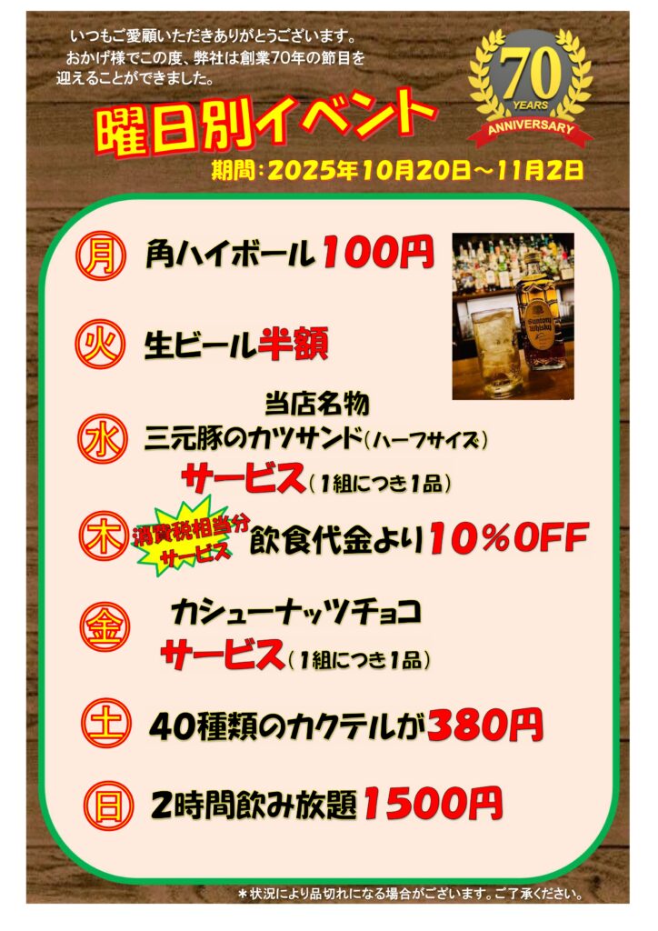 期間は2025年10月20日(月)から11月2日(日)まで。曜日ごとにとってもお得な特典をご用意しました。